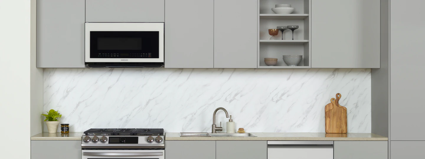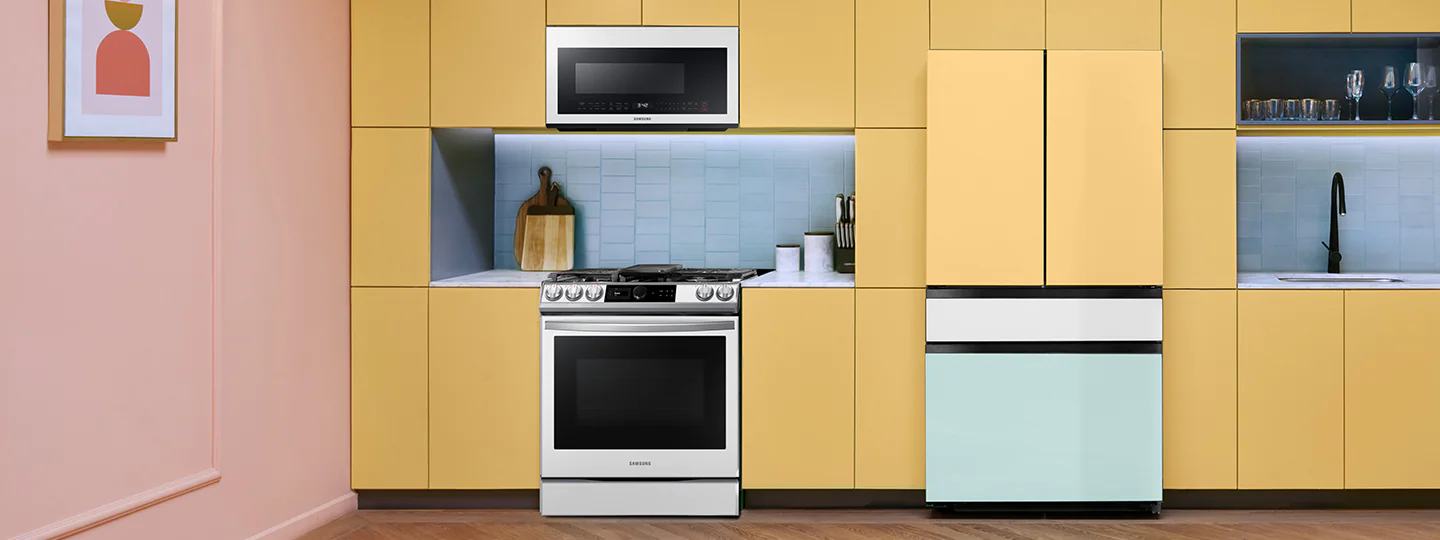 Bring more style, convenience and flexibility to your kitchen with Bespoke slide-in range and Over-the-range microwave. Available in Navy Steel and White Glasses finishes, create a combination that reflects your personal style.