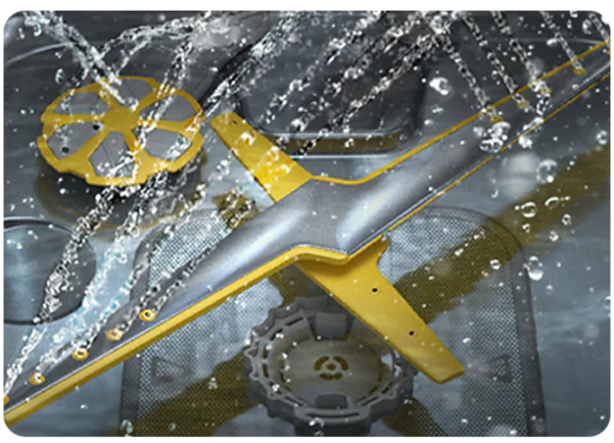 Twin-blade design and upgraded jets tackle more grime and save more water.