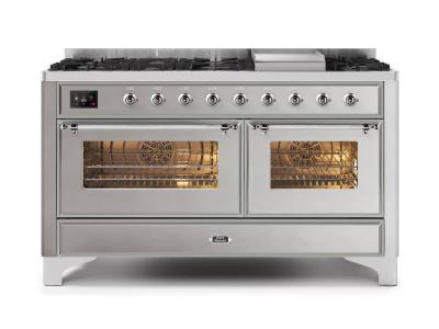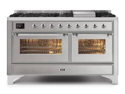 60" ILVE Majestic II Dual Fuel Natural Gas Freestanding Range with Chrome Trim in Stainless Steel -