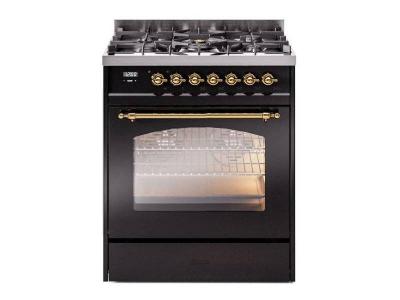 30" ILVE Nostalgie II Dual Fuel Freestanding Range in Gloss Black with Brass Trim - UP30NMP/BKG LP