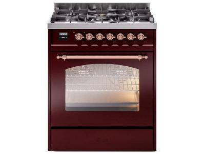 30" ILVE Nostalgie II Dual Fuel Natural Gas Freestanding Range in Burgundy with Copper Trim - UP30NM
