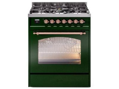 30" ILVE Nostalgie II Dual Fuel Natural Gas Freestanding Range in Emerald Green with Copper Trim - U