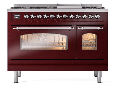 48" ILVE Nostalgie II Dual Fuel Natural Gas Freestanding Range in Burgundy with Chrome Trim - UP48FN