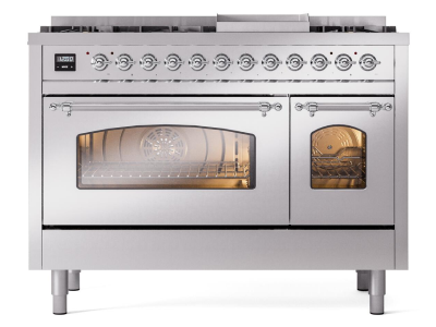 48" ILVE Nostalgie II Dual Fuel Natural Gas Freestanding Range in Stainless Steel with Chrome Trim -