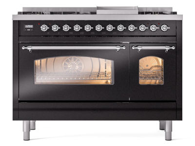48" ILVE Nostalgie II Dual Fuel Natural Gas Freestanding Range in Glossy Black with Chrome Trim - UP