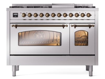 48" ILVE Nostalgie II Dual Fuel Natural Gas Freestanding Range in Stainless Steel with Bronze Trim -