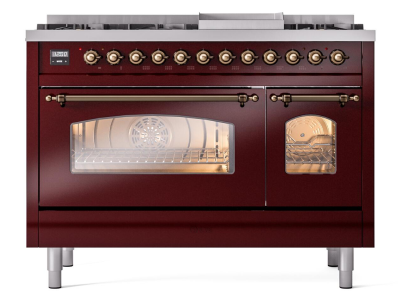 48" ILVE Nostalgie II Dual Fuel Liquid Propane Freestanding Range in Burgundy with Bronze Trim - UP4