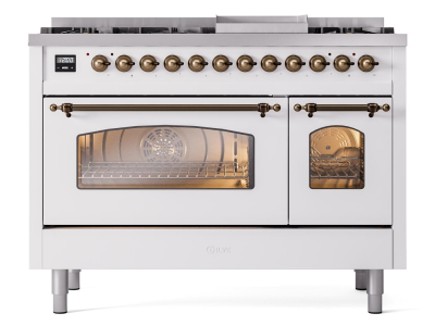 48" ILVE Nostalgie II Dual Fuel Liquid Propane Freestanding Range in White with Bronze Trim - UP48FN