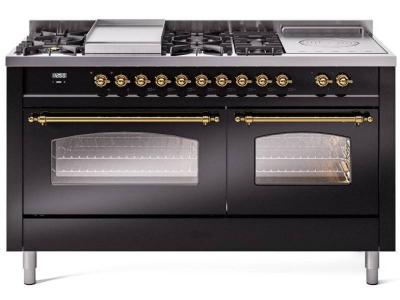 60" ILVE Nostalgie II Dual Fuel Liquid Propane Freestanding Range in Glossy Black with Brass Trim -
