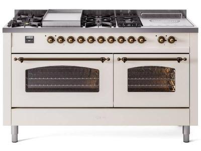 60" ILVE Nostalgie II Dual Fuel Natural Gas Freestanding Range in Antique White with Bronze Trim - U