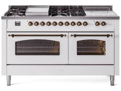 60" ILVE Nostalgie II Dual Fuel Natural Gas Freestanding Range in White with Bronze Trim - UP60FSNMP