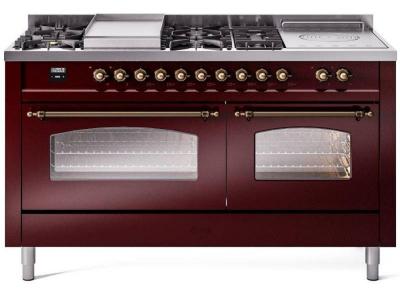 60" ILVE Nostalgie II Dual Fuel Natural Gas Freestanding Range in Burgundy with Bronze Trim - UP60FS