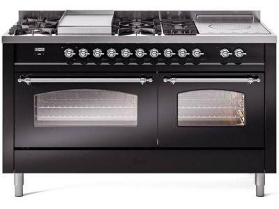 60" ILVE Nostalgie II Dual Fuel Natural Gas Freestanding Range in Glossy Black with Chrome Trim - UP
