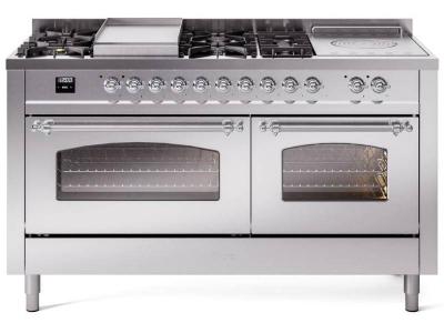 60" ILVE Nostalgie II Dual Fuel Natural Gas Freestanding Range in Stainless Steel with Chrome Trim -