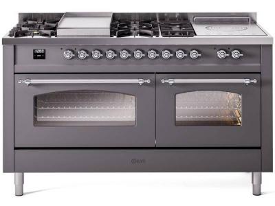 60" ILVE Nostalgie II Dual Fuel Natural Gas Freestanding Range in Matte Graphite with Chrome Trim -