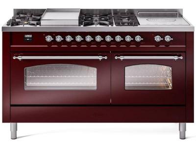 60" ILVE Nostalgie II Dual Fuel Natural Gas Freestanding Range in Burgundy with Chrome Trim - UP60FS