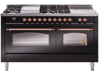 60" ILVE Nostalgie II Dual Fuel Liquid Propane Freestanding Range in Glossy Black with Copper Trim -