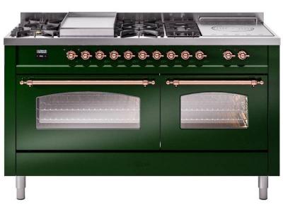 60" ILVE Nostalgie II Dual Fuel Liquid Propane Freestanding Range in Emerald Green with Copper Trim