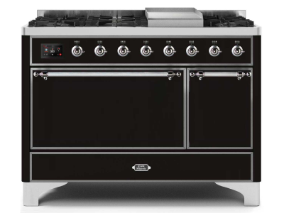 48" ILVE Majestic II Dual Fuel Natural Gas Freestanding Range in Glossy Black with Chrome Trim - UM1