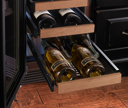 All Perlick undercounter wine shelves are full extension, pulling completely out of the cabinet for easy stocking and retrieving of product. Shelving is black vinyl-dipped to provide additional vibration protection, and shelving glides smoothly in and out of the cabinet on stainless steel ball bearing glides.