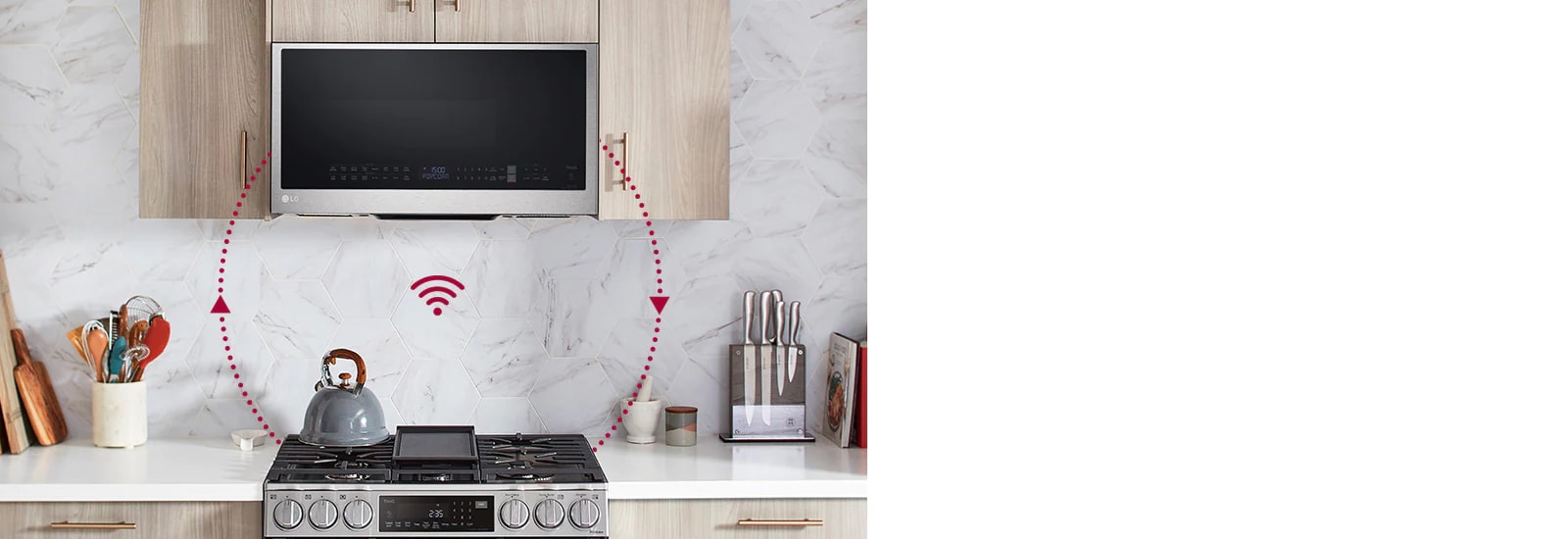 Connect your compatible Wi-Fi enabled LG microwave and range through the ThinQ app to enjoy the convenience of automatic pairing. Your microwave's vent and light will automatically turn on and off when your range cooktop is turned on or off, so you won't have to lift a finger when cooking.