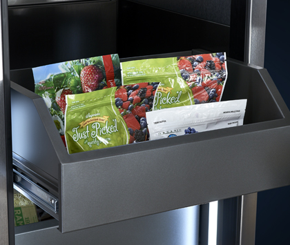 Open drawer bins provide quick access to frozen goods, and an open-concept design makes it easy to see stored products at a glance.