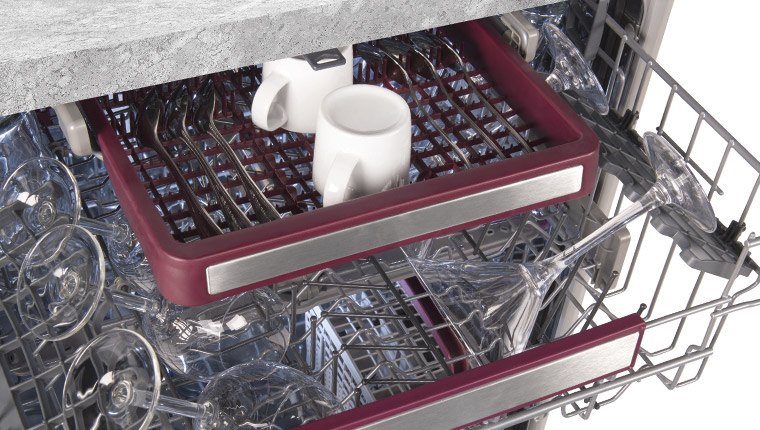 One of the most popular features among high-end dishwashers, this versatile rack is tailor-made for those occasions when you need to create extra space for cutlery and small items. Its clever dimensions mean you can still place tall stemware on either side and small cups or bowls underneath in the upper rack. When you prefer to place tall items in the middle of the upper rack, simply slide this third rack out completely.