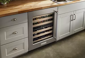 This Undercounter Wine Cellar with Full-Extension Wood-Front Racks holds up to 46 standard Bordeaux-size bottles. Two Temperature-Controlled Zones let you separate reds and whites to store each at the temperature you enjoy, and Motion-Activated LED Lighting turns on as you approach, making it easy to see what’s inside. Fully Flush Installation with Hidden Hinges provides a built-in look within cabinetry.