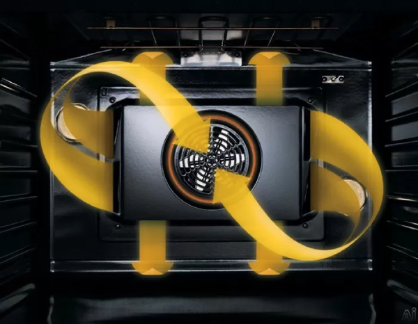 A powerful third heating element surrounds the convection fan and circulates heated air throughout the oven cavity.