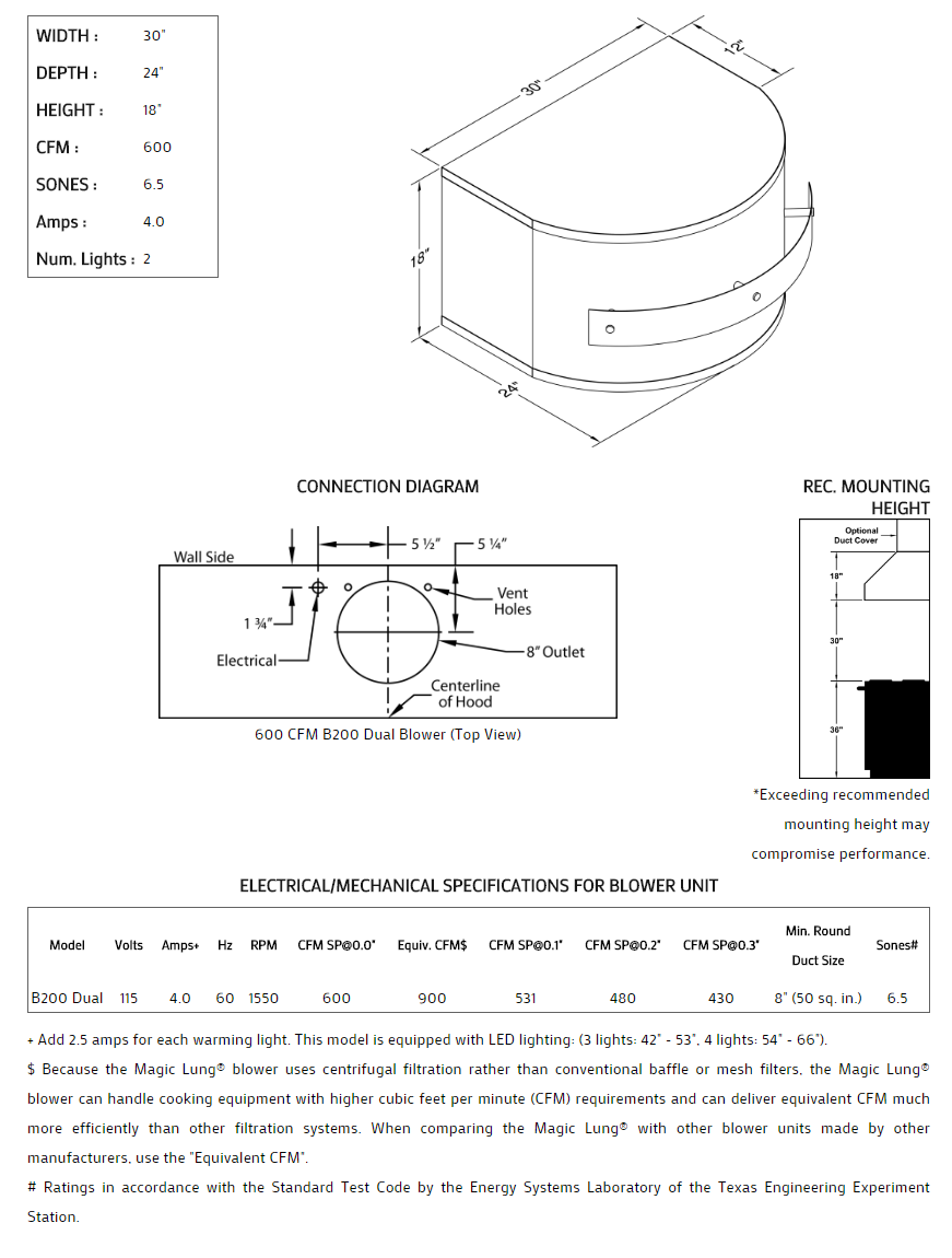 Rounded front with stand-off trim styling. Click on the models for a list of our base model numbers for standard sizes; simply select the model you need. This model is available in stainless steel with standard mirror stainless trim. All Vent-A-Hood Magic Lung products are suitable for use in damp locations (outdoor applications such as a covered patio) when installed in a GFCI protected branch circuit. Recommended mounting height is 30" above the cooking surface.