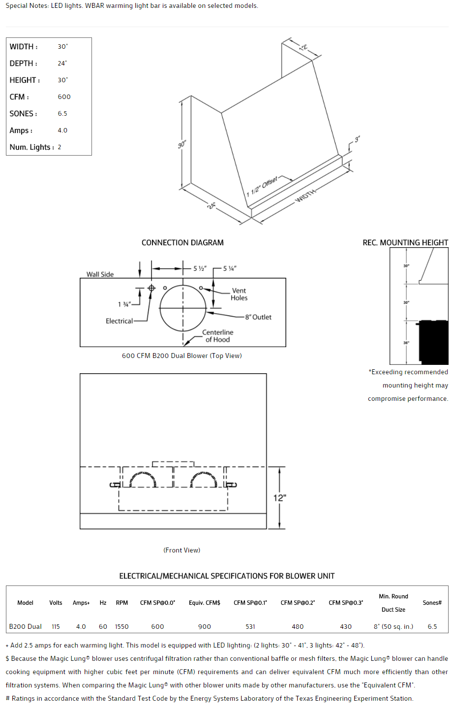 Features clean slope and defined front end. Heat lamps may also be added to selected models. Click on the models for a list of our base model numbers for standard sizes; simply select the model you need, and then specify the finish (painted, stainless steel, real brass, real copper, or hammered copper). Recommended mounting height is 30" above the cooking surface. All Vent-A-Hood products are suitable for use in damp locations (outdoor applications such as a covered patio) when installed in a GFCI protected branch circuit.