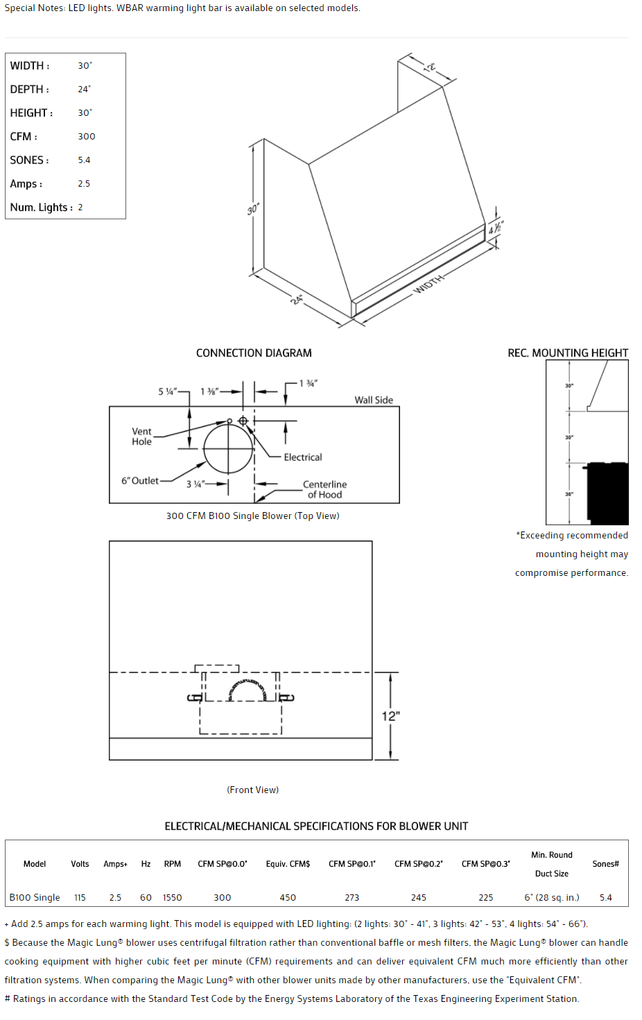 ** EQUIV CFM : Because the Magic Lung® blower uses centrifugal filtration rather than conventional baffle or mesh filters, the Magic Lung® blower can handle cooking equipment with higher cubic feet per minute (CFM) requirements and can deliver equivalent CFM much more efficiently than other filtration systems. When comparing the Magic Lung® with other blower units made by other manufacturers, use the “Equivalent CFM”.