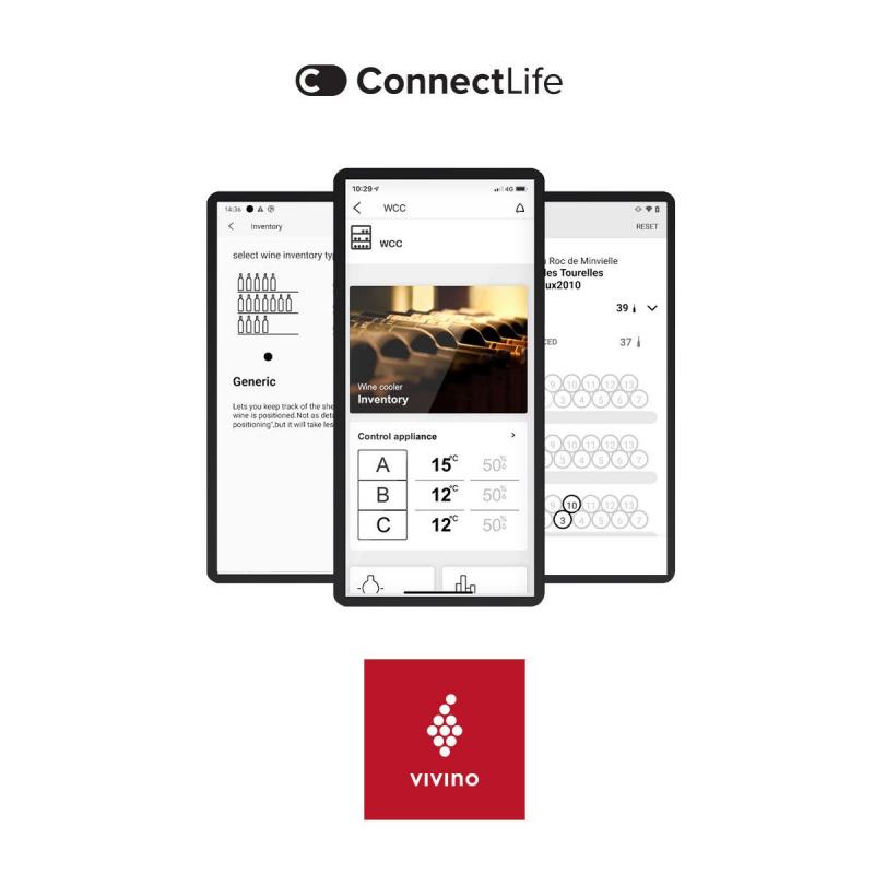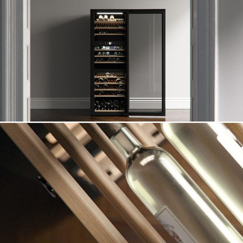 A freestanding wine climate cabinet with three individual temperature zones and a serving area where you prepare your wine for serving. There is room for up to 190 wine bottles and they are safely resting on wooden racks with soft sliding telescopic rails and the door glass with premium UV-filter protects the wine from harmful UV-light. You will have several functions as well as access to the vast Vivino database from your smart phone or tablet, from which you have a perfect overview of your personal collection.