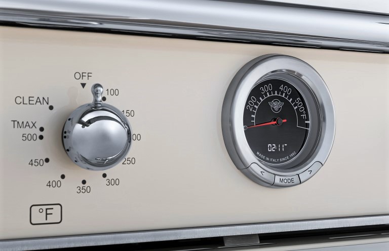 The 5.7 cubic feet self-cleaning oven is the largest in its class, with dual convection fan for balanced airflow and even temperature baking and roasting on 7 shelf levels. The elegant digital gauge gives precise control of oven temperature during pre-heating, roasting and baking, and has integrated controls for the food temperature probe. The extra wide electric broiler with optional convection is ideal for grilling and searing at high heat. The oven includes convenient features such as smooth telescopic glides for the oven shelves and soft-close doors. The edge-to-edge interior oven glass door maximizes interior volume and can be wiped clean without effort.