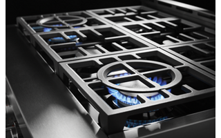Expand your skills with a 36-inch KitchenAid® Commercial Style Range with 6 burners. This dual fuel range combines a gas cooktop with the even baking of an electric oven. Two 20,000 BTU Ultra Power™ Dual-Flame Burners offer the power and precision to successfully sear, simmer, stir-fry and sauté. Even-Heat™ True Convection helps you achieve more consistent baking and roasting.