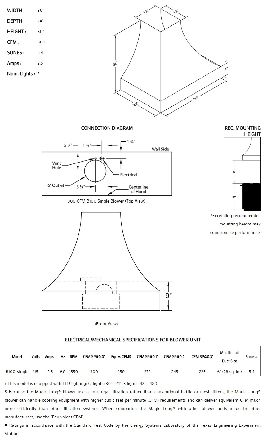 Concave with thick lip styling. Click on the models for a list of our base model numbers for standard sizes; simply select the model you need. This model is available in stainless steel with standard mirror stainless trim. All Vent-A-Hood Magic Lung products are suitable for use in damp locations (outdoor applications such as a covered patio) when installed in a GFCI protected branch circuit. Recommended mounting height is 30" above the cooking surface.