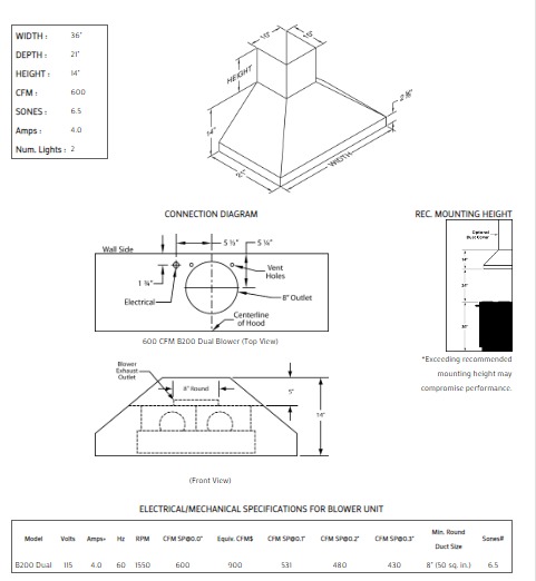 EQUIV CFM : Because the Magic Lung® blower uses centrifugal filtration rather than conventional baffle or mesh filters, the Magic Lung® blower can handle cooking equipment with higher cubic feet per minute (CFM) requirements and can deliver equivalent CFM much more efficiently than other filtration systems. When comparing the Magic Lung® with other blower units made by other manufacturers, use the “Equivalent CFM”.