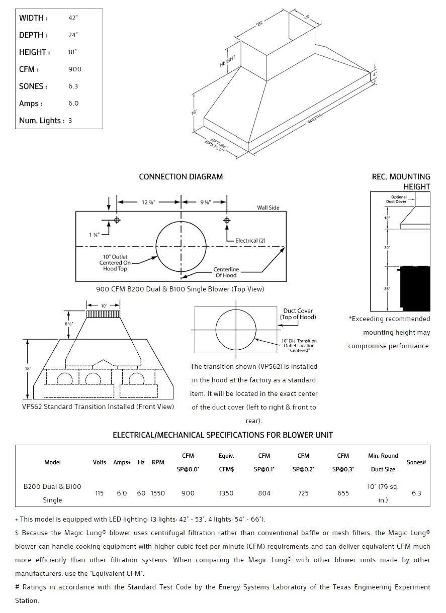 This Euroline Pro is boldly designed to cover light residential, "commercial type" cooking equipment. To order a 27" depth, add an 'X' after 'EP' in the model number. The Euroline Pro Series with Emerald Lip is also available with a 26" wide x 14" deep top to allow for higher CFM requirements . Heat lamps are not available on this model. Click on the models for a list of our base model numbers for standard sizes; simply select the model you need, and then specify the finish (painted, stainless steel, real brass, real copper, or hammered copper). Recommended mounting height is 30" from the cooking surface. Shown with matching wall mount duct cover (sold separately), available in standard sizes for 8', 9', and 10' ceiling heights or in custom sizes. All Vent-A-Hood products are suitable for use in damp locations (outdoor applications such as a covered patio) when installed in a GFCI protected branch circuit.