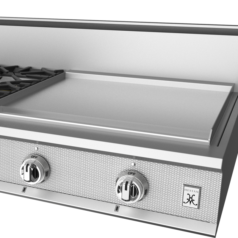 The 48” Hestan rangetop with griddle delivers searing culinary power with a sealed burner system delivering exceptional temperature control for culinary power up to 23,000 BTUs and as low as 500 BTUs. The 24” commercial-grade stainless steel gas griddle makes breakfast a cinch with superior heating and a thermostat for precise temperature control, while the continuous grates and backlit knobs combine stunning form and function.