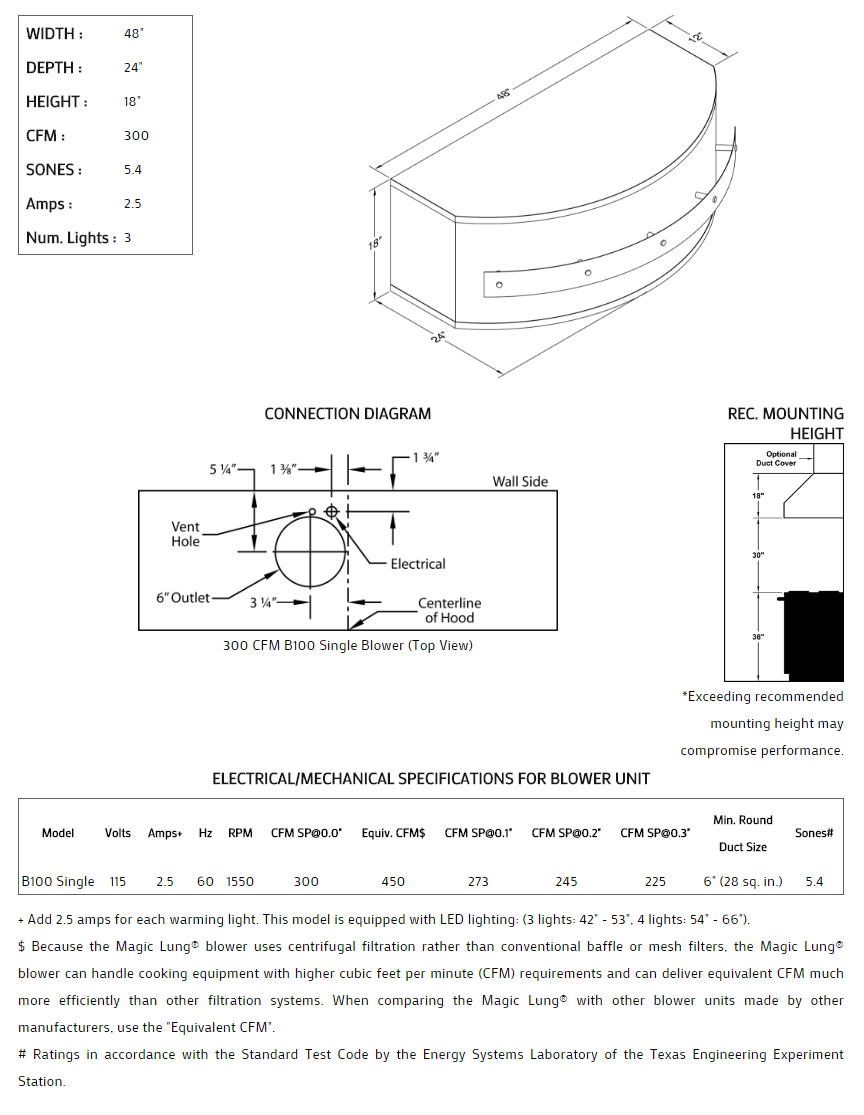 Rounded front with stand-off trim styling. Click on the models for a list of our base model numbers for standard sizes; simply select the model you need. This model is available in stainless steel with standard mirror stainless trim. All Vent-A-Hood Magic Lung products are suitable for use in damp locations (outdoor applications such as a covered patio) when installed in a GFCI protected branch circuit. Recommended mounting height is 30" above the cooking surface.