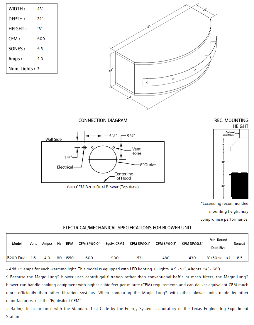 Rounded front with stand-off trim styling. Click on the models for a list of our base model numbers for standard sizes; simply select the model you need. This model is available in stainless steel with standard mirror stainless trim. All Vent-A-Hood Magic Lung products are suitable for use in damp locations (outdoor applications such as a covered patio) when installed in a GFCI protected branch circuit. Recommended mounting height is 30" above the cooking surface.