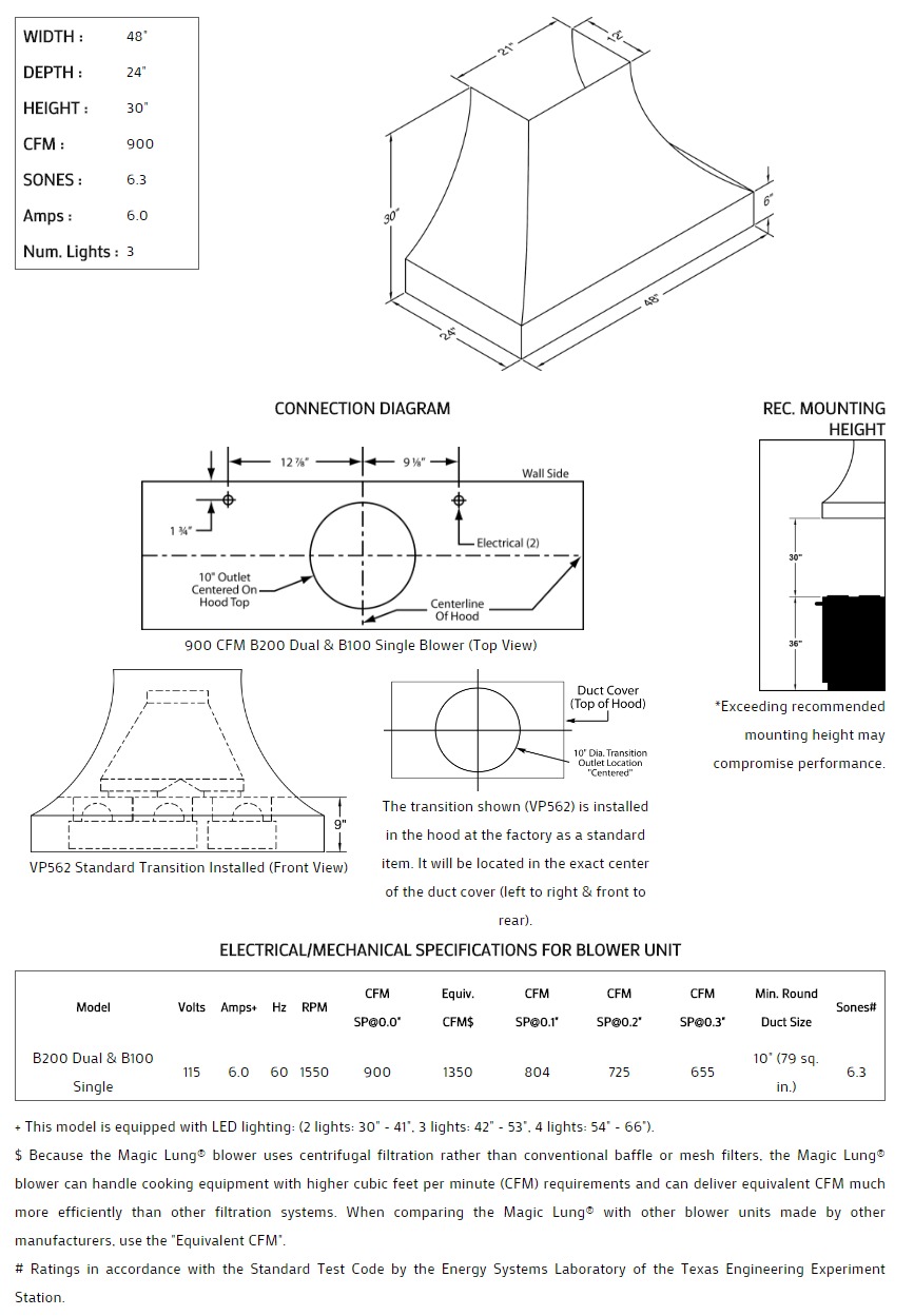Concave with thick lip styling. Click on the models for a list of our base model numbers for standard sizes; simply select the model you need. This model is available in stainless steel with standard mirror stainless trim. All Vent-A-Hood Magic Lung products are suitable for use in damp locations (outdoor applications such as a covered patio) when installed in a GFCI protected branch circuit. Recommended mounting height is 30" above the cooking surface.