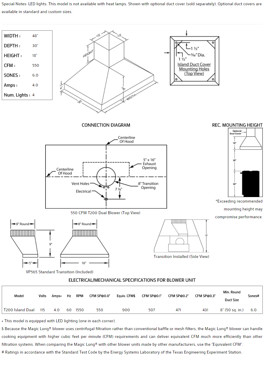 ** EQUIV CFM : Because the Magic Lung® blower uses centrifugal filtration rather than conventional baffle or mesh filters, the Magic Lung® blower can handle cooking equipment with higher cubic feet per minute (CFM) requirements and can deliver equivalent CFM much more efficiently than other filtration systems. When comparing the Magic Lung® with other blower units made by other manufacturers, use the “Equivalent CFM”.