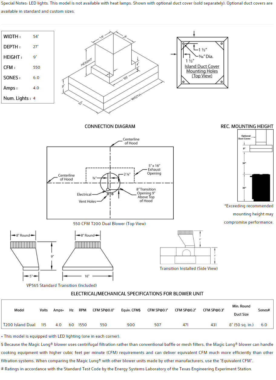 ** EQUIV CFM : Because the Magic Lung® blower uses centrifugal filtration rather than conventional baffle or mesh filters, the Magic Lung® blower can handle cooking equipment with higher cubic feet per minute (CFM) requirements and can deliver equivalent CFM much more efficiently than other filtration systems. When comparing the Magic Lung® with other blower units made by other manufacturers, use the “Equivalent CFM”.