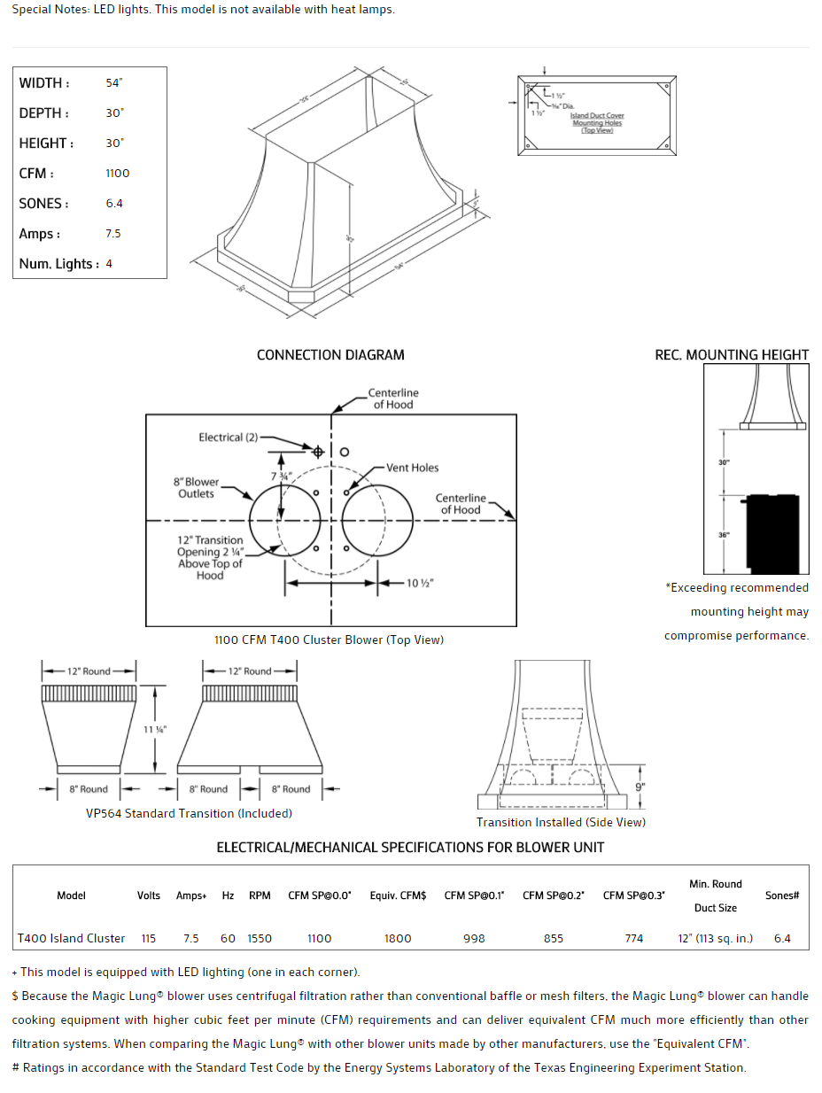 Concave with lip styling. Click on the models for a list of our base model numbers for standard sizes; simply select the model you need. This model is available in stainless steel with standard mirror stainless trim. All Vent-A-Hood Magic Lung products are suitable for use in damp locations (outdoor applications such as a covered patio) when installed in a GFCI protected branch circuit. Recommended mounting height is 30" above the cooking surface.
