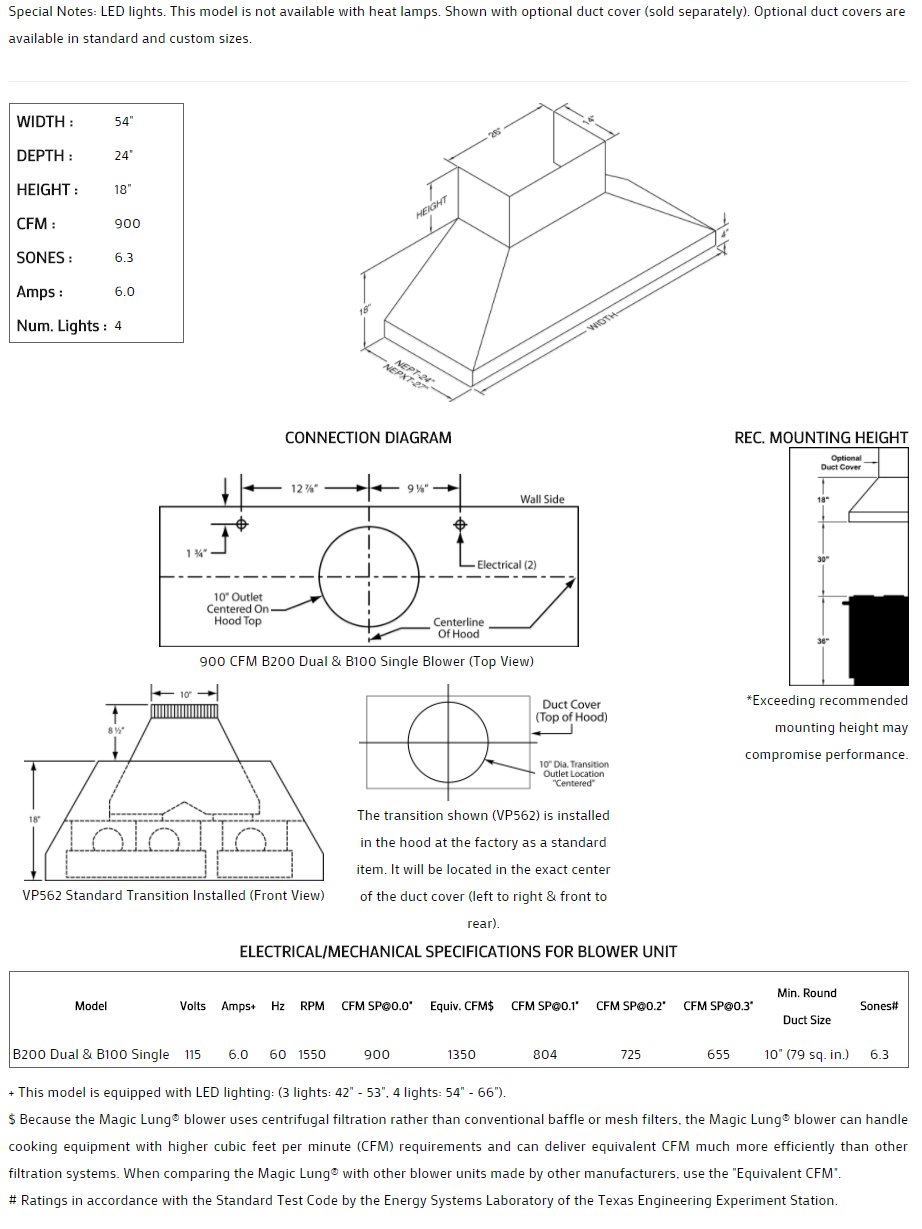 ** EQUIV CFM : Because the Magic Lung® blower uses centrifugal filtration rather than conventional baffle or mesh filters, the Magic Lung® blower can handle cooking equipment with higher cubic feet per minute (CFM) requirements and can deliver equivalent CFM much more efficiently than other filtration systems. When comparing the Magic Lung® with other blower units made by other manufacturers, use the “Equivalent CFM”.