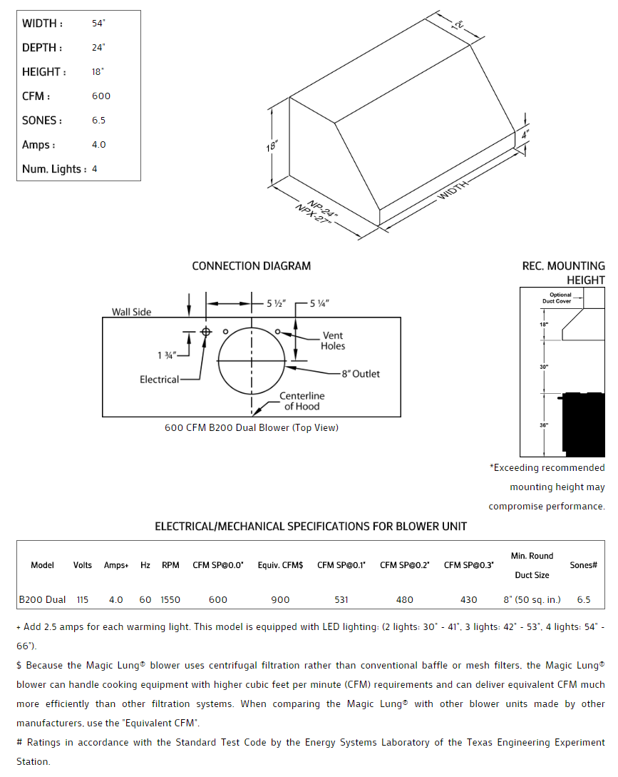 Rounded front lip provides a modern visual impact. Includes the Magic Lung® blower system. Lights feature a dual switch for dimming. Equipped with the SensaSource® heat sensor. Available in popular standard or custom paint colors, stainless steel, real brass, real copper or hammered copper. Recommended mounting height is 30" above the cooking surface. Suitable for use in covered outdoor applications when installed in a GFCI protected branch circuit. Also available in custom sizes.