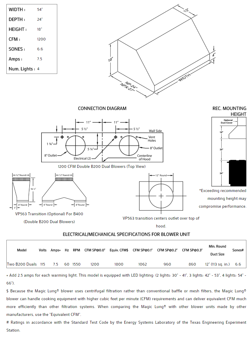54" Vent-A-Hood Premier Magic Lung Professional Or Standard Wall Mounted Hood - NPH18454SS