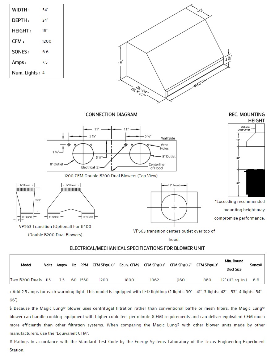 54" Vent-A-Hood Premier Magic Lung Professional Or Standard Wall Mounted Hood - SLH18454SS