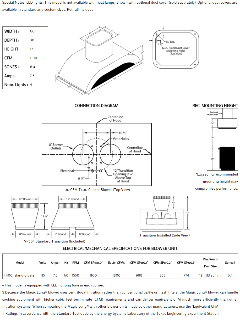 ** EQUIV CFM : Because the Magic Lung® blower uses centrifugal filtration rather than conventional baffle or mesh filters, the Magic Lung® blower can handle cooking equipment with higher cubic feet per minute (CFM) requirements and can deliver equivalent CFM much more efficiently than other filtration systems. When comparing the Magic Lung® with other blower units made by other manufacturers, use the “Equivalent CFM”.